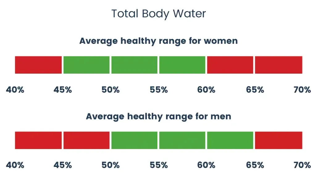 Water plays a vital role in many of the body's processes and is found in every cell, tissue and organ. Maintaining a healthy totaly body water percentage will ensure the body functions efficiently and will reduce the risk of developing associated health problems.